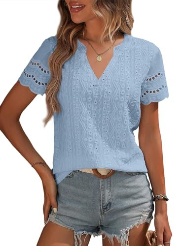 EVALESS Spring Summer Tops for Women 2025 Fashion Trendy Dressy Boho Lace V Neck Blouses Short Sleeve Eyelet Shirts Petite Vacation Casual Clothing Blue Small